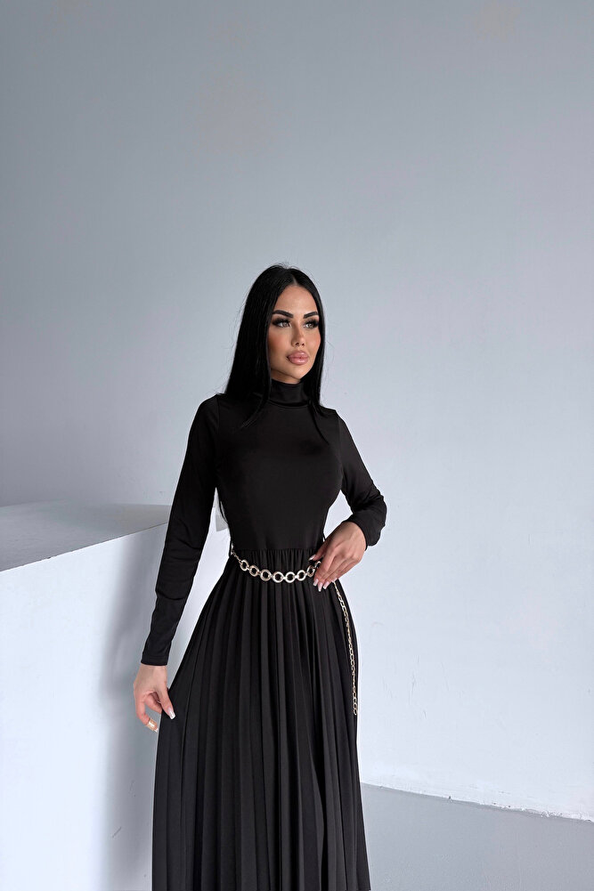 Balıkçı Yaka Eteği Pileli Zincir Kemer Detaylı Triko Kahverenği Elbise