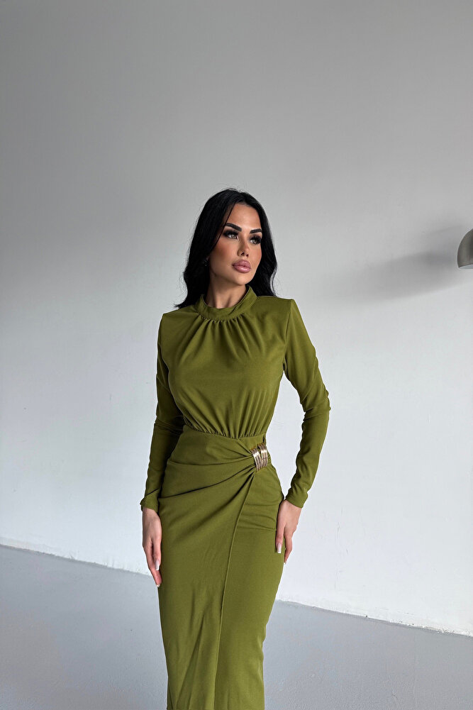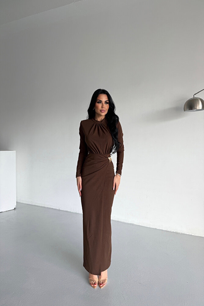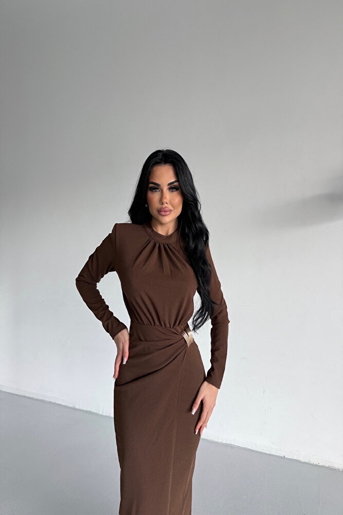 Bisiklet Yaka Yandan Tokalı Özel Tasarım Kahverengi Elbise