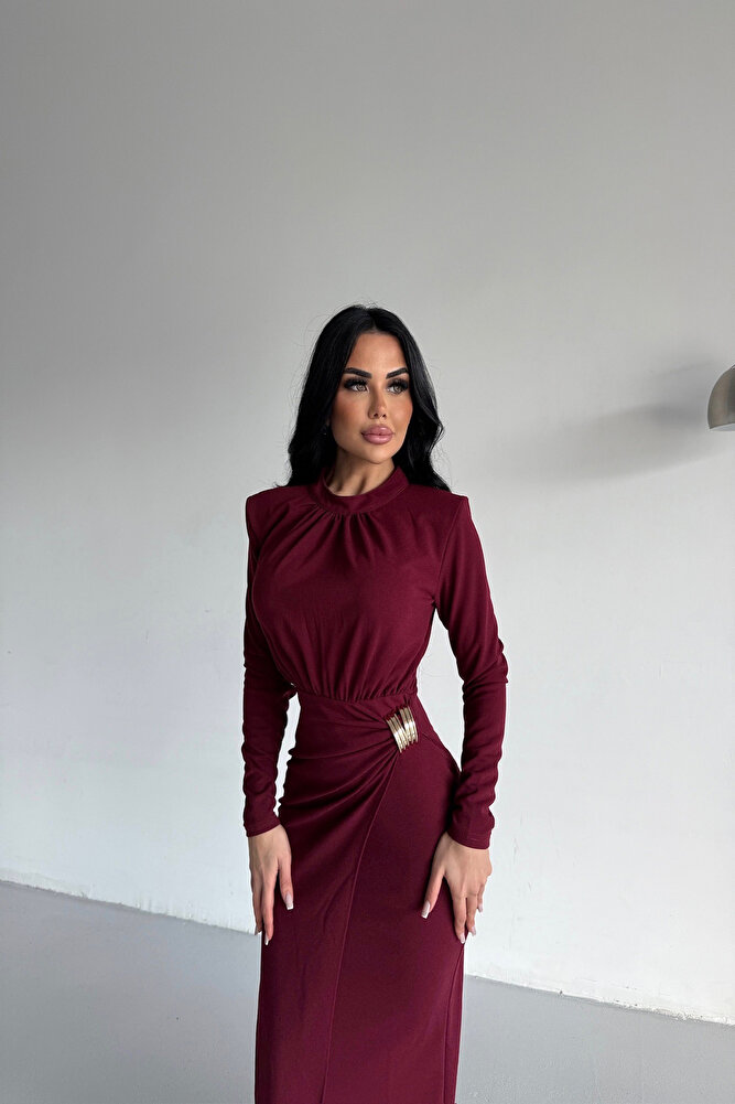 Kruvaze Yaka Simli Özel Tasarım Bordo Elbise