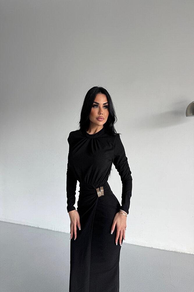 Balıkçı Yaka Gögüs Ve kol Detaylı Kadife Kumaş Siyah Elbise