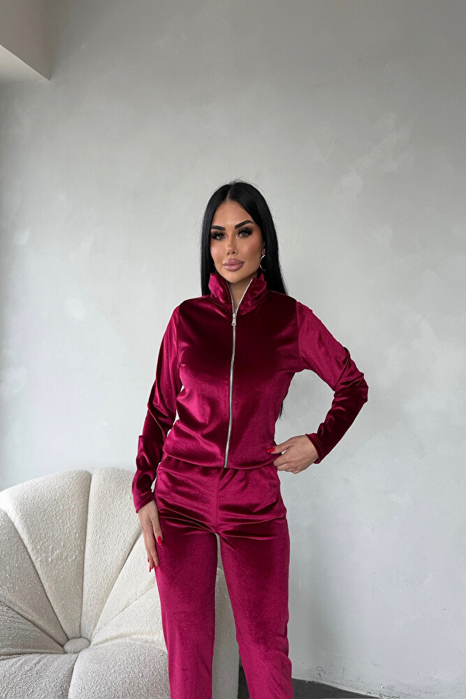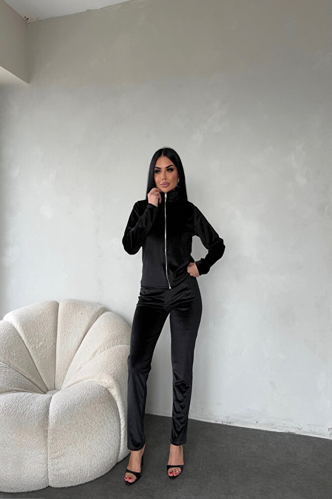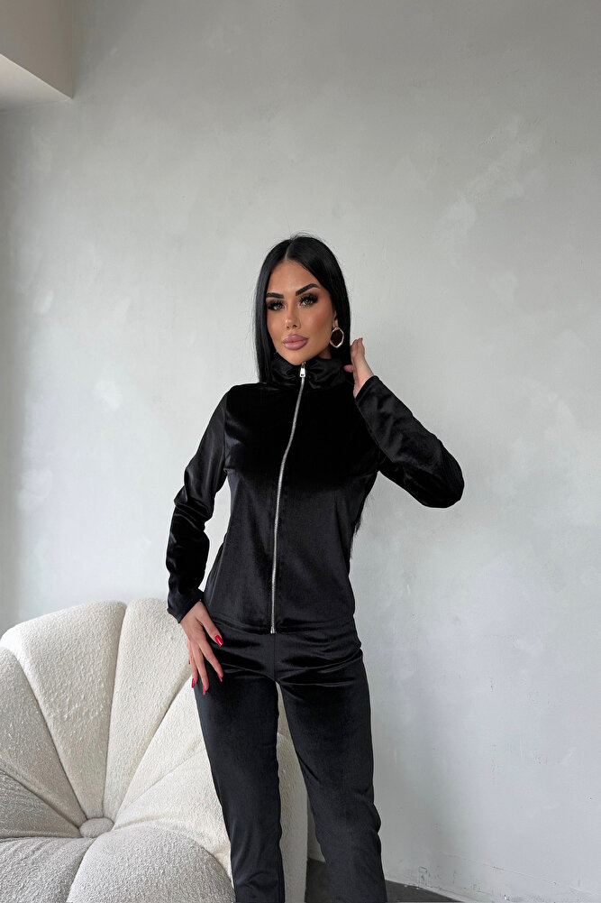 Dik Yaka Fermuarlı Kadife Eşofman Siyah Takım