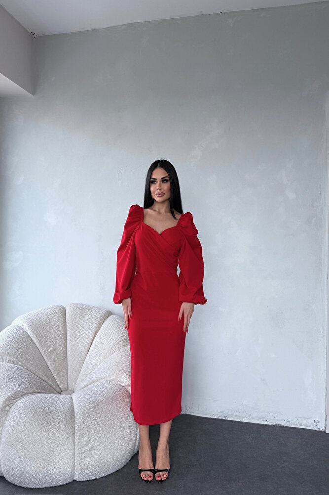 Kalp Yaka Prenses Kol Detaylı Kırmızı Elbise