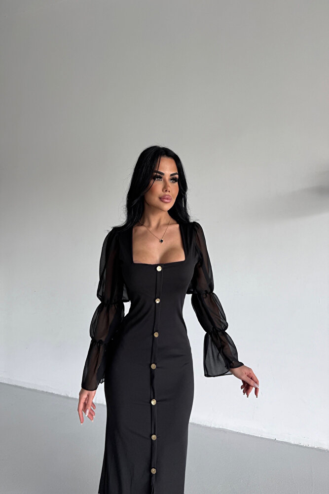 – Kare yaka tasarımı ile zarif bir görünüm sunar ve şık ortamlarda dikkat çekici bir stil oluşturur.; – Uzun kollu ve tül detaylı yapısı, kış aylarında hem şıklığı hem de rahatlığı bir arada sunar.; – Düğme detayları ile klasik ve modern çizgileri birleştirerek zamansız bir parça haline getirir.; – Kemersiz ve kapsız tasarımı sayesinde rahat hareket etme özgürlüğü sağlar.; – Astarsız yapısıyla hafif ve konforlu bir kullanım sunarken, düz deseniyle kolayca kombinlenebilir.; – Orta kalınlıkta dokuma kumaşı, mevsim geçişlerinde ideal sıcaklık dengesi sağlar.; – Yetişkin kadınlar için tasarlanmış bu elbise, seksi persona’yı ön plana çıkaran detaylara sahiptir.; – İç göstermeyen kumaşı ile güvenle giyilebilir; şık gece davetlerinden günlük zarif kombinlere kadar geniş kullanım imkanı sunar.; – TR menşei garantisiyle yerel üretim kalitesini yansıtır.;