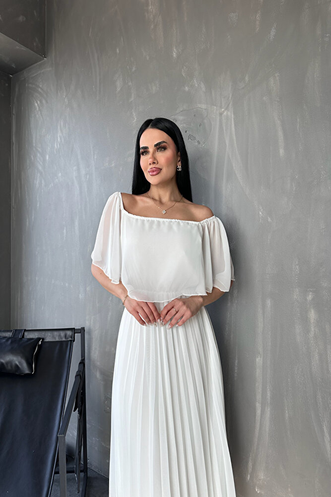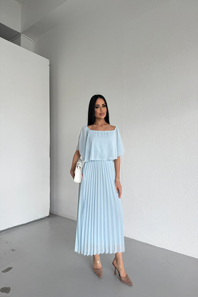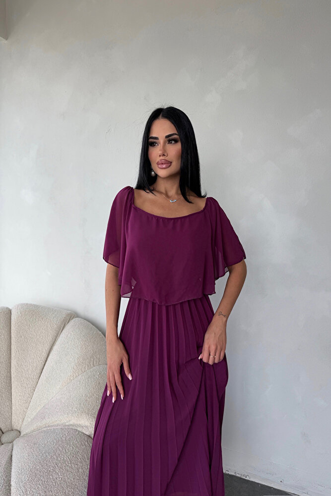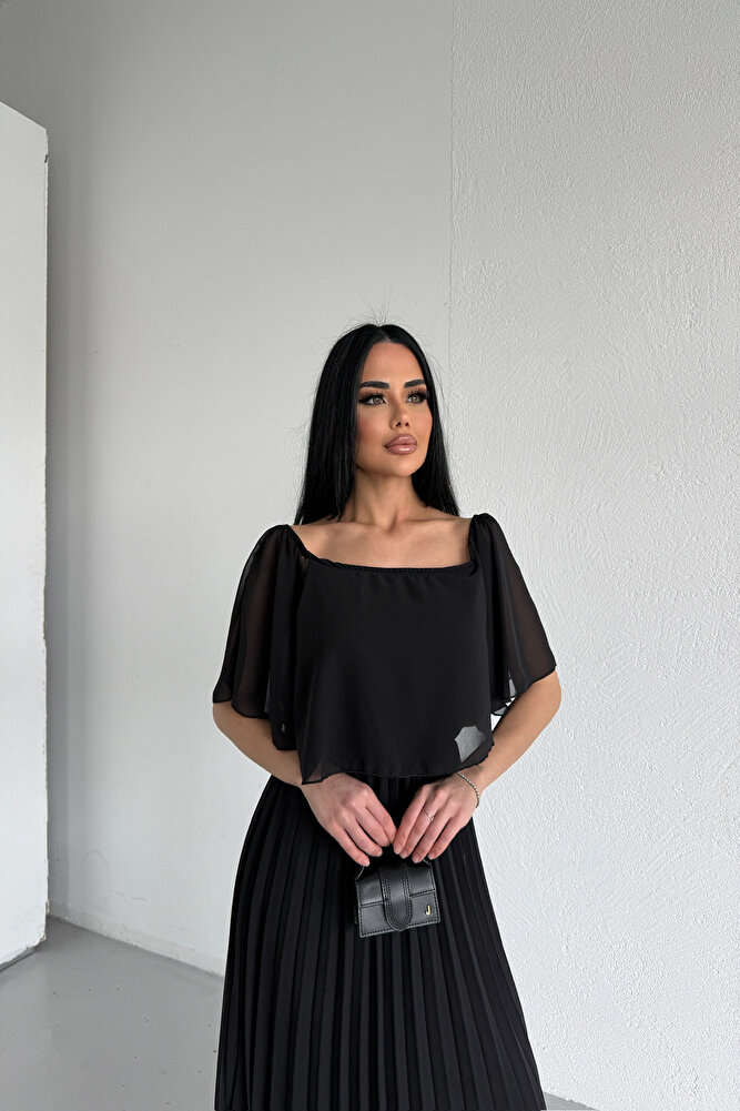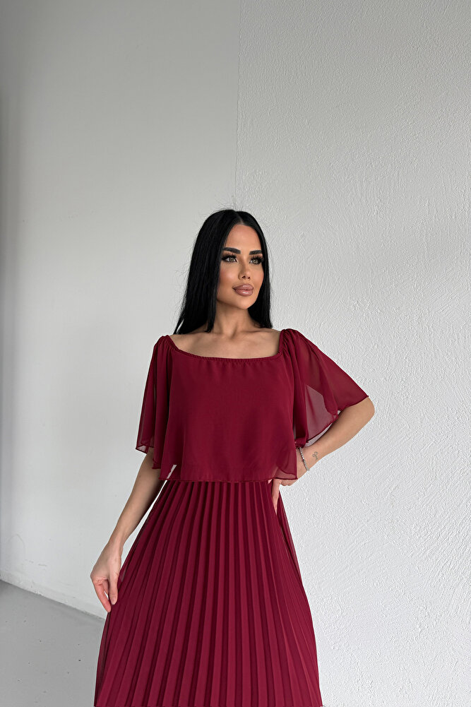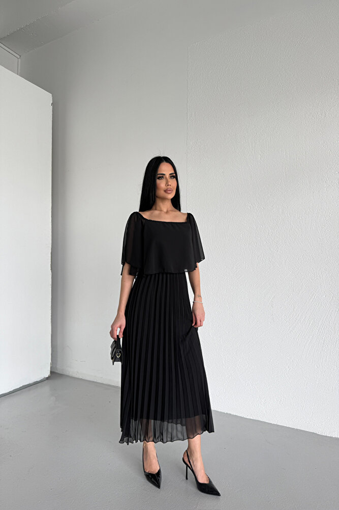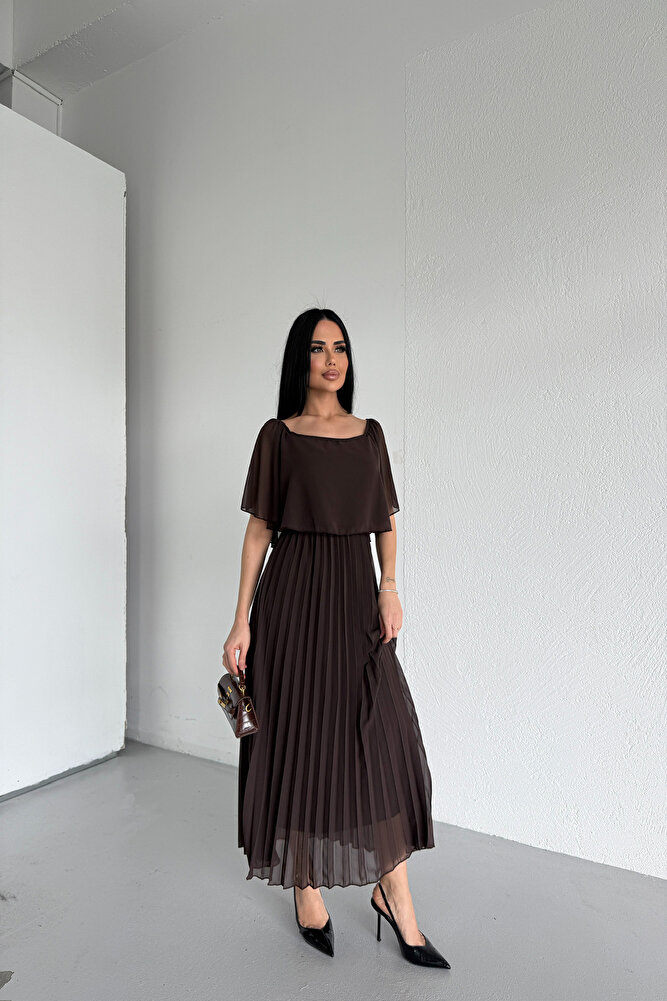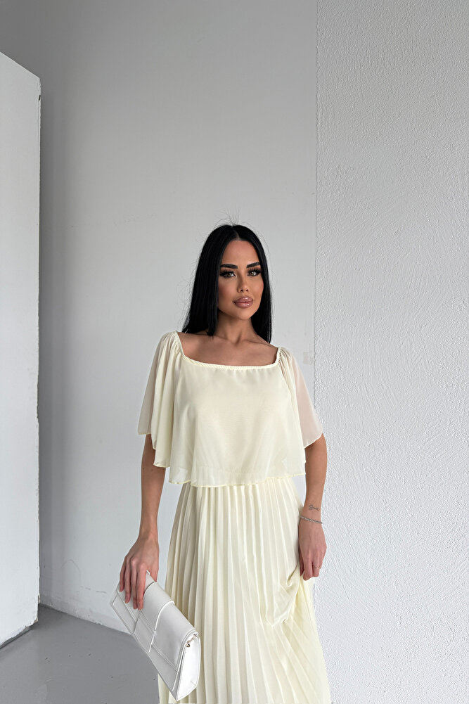 Kare Yaka Pileli Şifon Yazlık Elbise