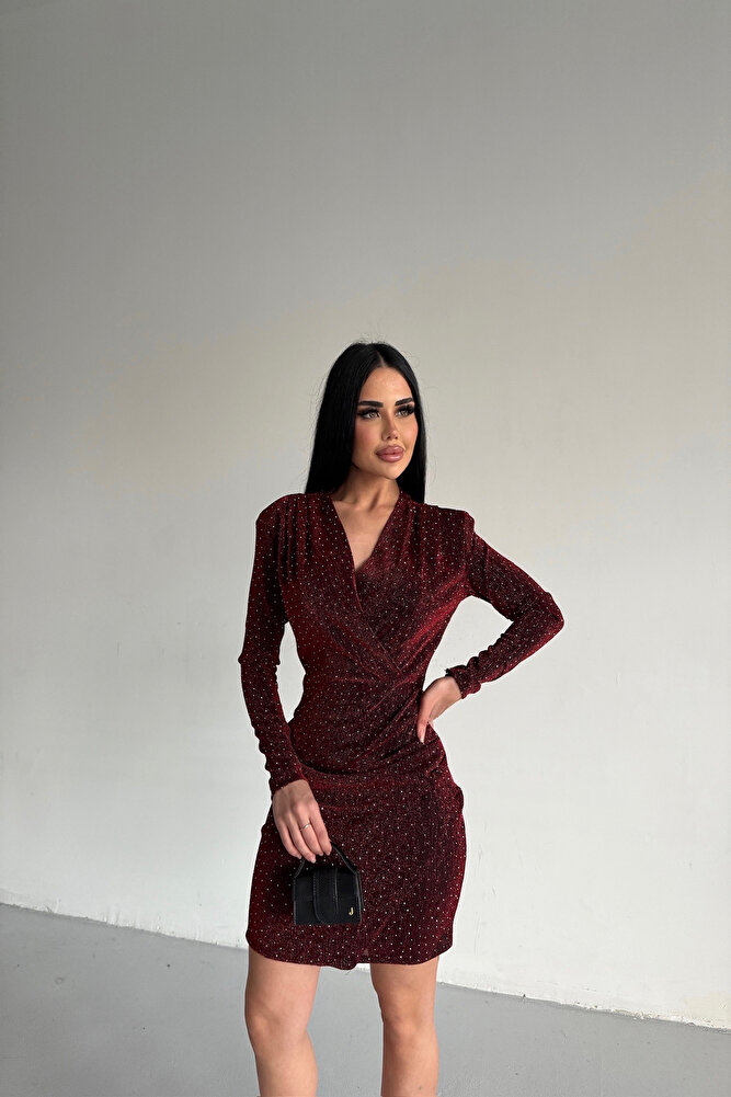 Kruvaze Yaka Buzy Kumaş Taş İşlemeli Bordo Elbise