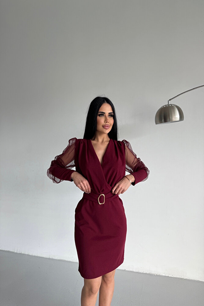 Kruvaze Yaka Kemerli Kolları Tüllü Siyah Elbise