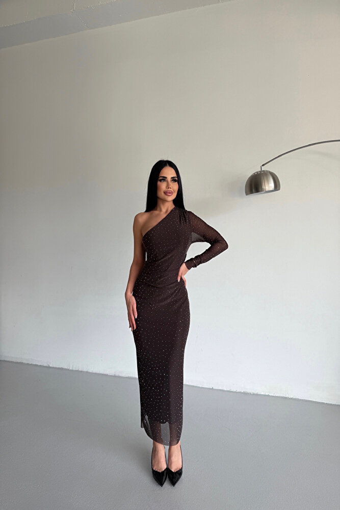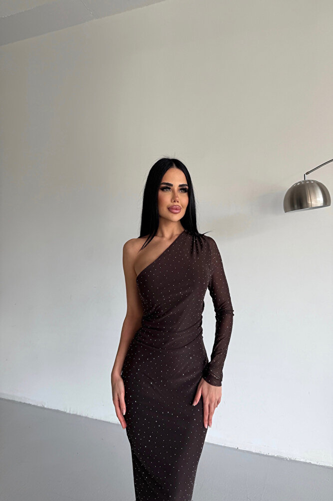 Tek Omuz Taş İşlemeli Özel Tasarım Kahverengi Elbise