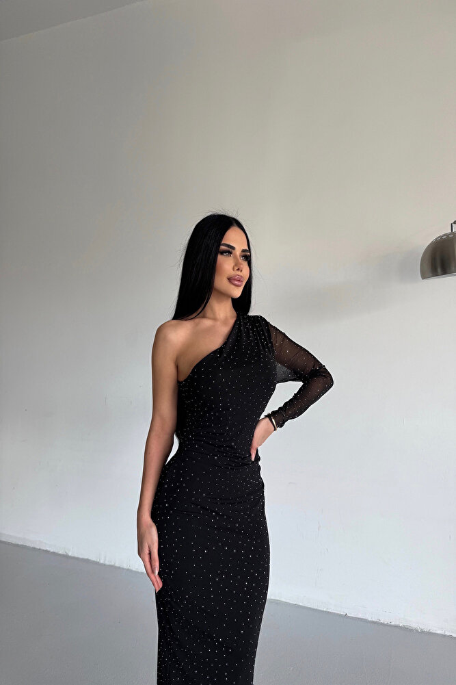 – Tek omuz tasarımı ile modern ve şık bir görünüm sunar.; – Orta kalınlıkta tül kumaşı, hem rahatlık hem de zarafet sağlar.; – Şık ve gece ortamları için ideal bir tercih olan bu elbise, özel anlarınızda göz alıcı bir stil yaratır.; – Trock / Taş baskı tekniği ile detaylandırılmış taş işlemeleri, elbiseye zarif bir dokunuş katar.; – Cepsiz tasarımı sayesinde minimal ve sade bir görünüm elde edilirken, taş baskılar ön plana çıkar.; – Astarlı yapısı ile konforlu bir kullanım sunarken, iç göstermeyen özelliğiyle rahatlıkla tercih edilebilir.; – Kemersiz tasarımı ile vücut hatlarınıza uyum sağlayarak feminen bir siluet oluşturur.; – Kapsız kap yapısı, elbisenin doğal ve zarif duruşunu destekler.; – Zarif koleksiyonun bir parçası olarak dikkat çekici detaylarıyla öne çıkar.; – Sürdürülebilirlik detayı bulunmayan bu ürün, modaya uygun tasarım anlayışını yansıtır.; – Düz deseniyle sadelikten yana olanların tercihi olacak şekilde tasarlanmıştır.; – İç göstermeyen yapısıyla rahat hareket etme özgürlüğü tanır.; – Yetişkin yaş grubuna hitap eden bu elbise, uzun boyu