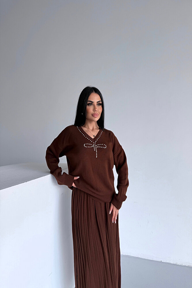 – V yaka tasarımı ile zarif bir görünüm sunar ve boynunuzu nazikçe sarar.; – Uzun kollu yapısı, kış aylarında sizi sıcak tutarken şık bir stil oluşturmanızı sağlar.; – İncili detaylarla süslenmiş bu takım, her ortamda dikkat çekici bir parıltı katar.; – Orta kalınlıkta triko materyali ile mevsim geçişlerinde ideal konforu sunar.; – Günlük kullanım için ideal olan bu takım, rahatlığı ve şıklığı bir arada arayanlar için uygundur.; – Cepsiz ve kemersiz tasarımıyla minimalist ve modern bir görünüm sağlar.; – Standart boyu sayesinde farklı vücut tiplerine uyum sağlayarak rahat bir kullanım sunar.; – Turkish origin – (Türkiye) menşeli ürün, yerel üretim kalitesini tercih edenler için idealdir.;
